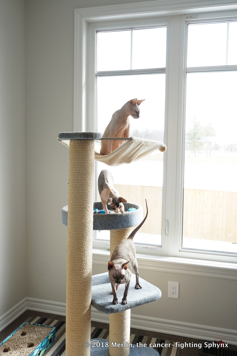 The daily adventures of four Sphynx: Dragonheart, a black and white tuxedo; Merlin, a blue lynx point and white fighting large cell lymphoma; Devi, a black and white rescue; and Chloe, a crazy tortoiseshell.